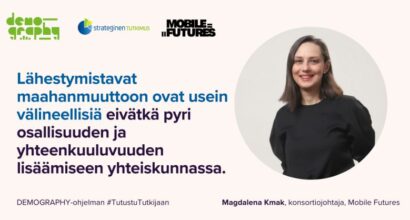 DEMOGRAPHY-ohjelma on julkaissut verkkosivuilleen koonnit ohjelman hankkeiden tutkimustuloksista. väestörakenteen muutoksia käsittelevistä tutkimuksista. Tavoitteena on tarjota tiedon käyttäjälle ajankohtaista ja luotettavaa tutkimustietoa väestörakenteen muutoksista helposti saatavilla olevassa muodossa - yhdestä paikasta tiiviisti.