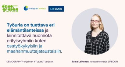 #TutustuTutkijaan: johtava tutkija Taina Leinonen, Työterveyslaitos, LIFECON-hankkeen konsortiojohtaja Taina on väestötieteeseen erikoistunut sosiaalitieteilijä. Hän tutkii työkyvyttömyyttä, terveyttä ja työmarkkinoille osallistumista...