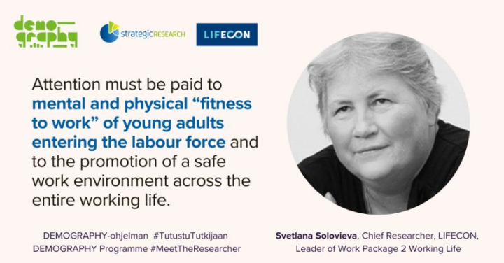 MeetTheResearcher TutustuTutkijaan Svetlana Solovieva, Chief Researcher at the Työterveyslaitos – Finnish Institute of Occupational Health (FIOH) and a deputy principal investigator in LIFECON, is responsible for the Work Package concerning Working Life.