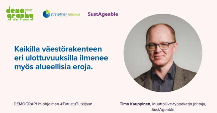 – Yksi väestörakenteen alueellisiin eroihin liittyvä hankala kysymys on se, että muuttaminen toiselle alueelle saattaa yksilön tai kotitalouden kannalta olla hyödyllistä esimerkiksi työllistymisen tai asuinympäristön viihtyvyyden kannalta, mutta tällaiset parempien mahdollisuuksien perässä tapahtuvat muutot voivat vaikeuttaa tasapainoista kehitystä lähtöalueilla, Timo sanoo.
